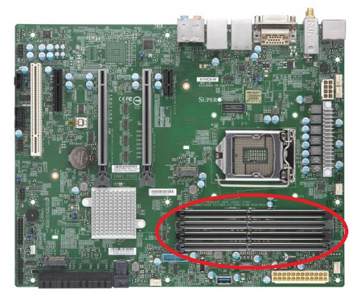 메인보드를 보시면 빨간 원 안이 램의 위치입니다. 본체를 열어서 보시면