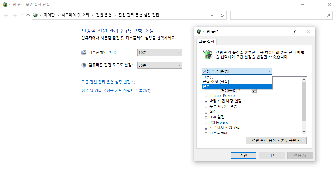 전원 옵션을 설정을 절전으로 바꿔도 변화가 없다면