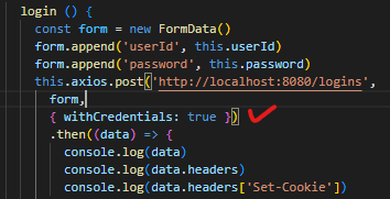 Cross Origin일 경우 쿠키가 전달되지 않는다. Cross Origin의 기본은 쿠키 전송이 false이다.