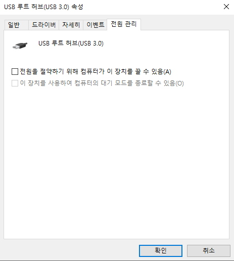 전원 관리에서 "전원을 절역 하기 위해 컴퓨터가 이 장치를 끌 수 있음" 부분에 체크박스를 취소해주세요.