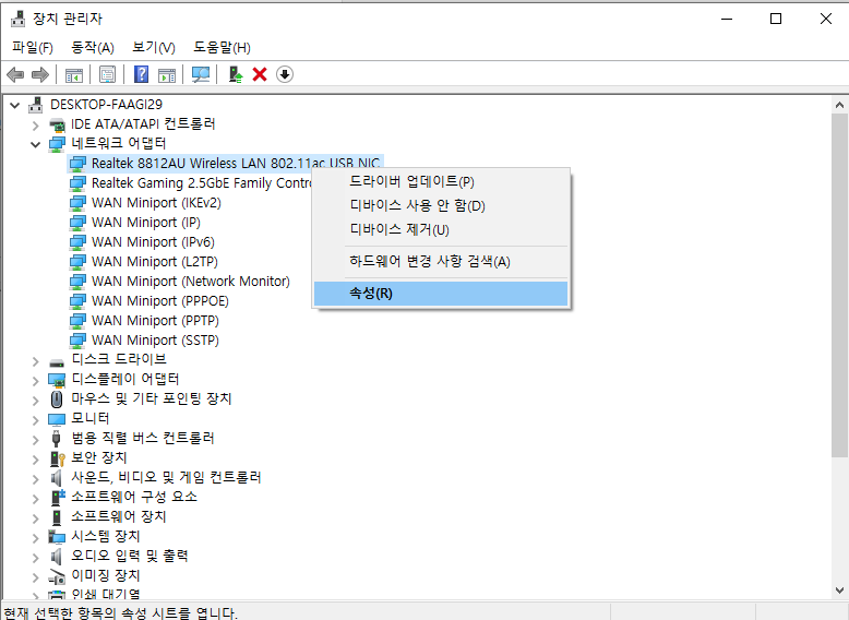 여기서 네트워크 어댑터란을 펼치면, 본인의 무선랜 USB와 일치하는 부분의 속성을 들어가주시면 됩니다.