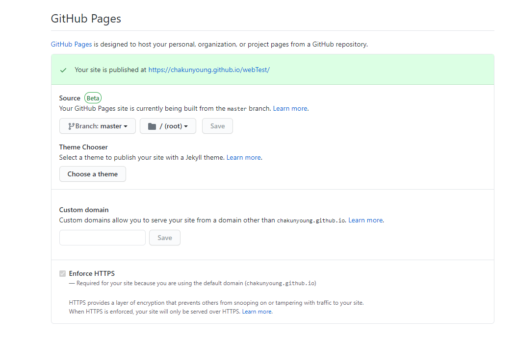 쭉 내리다 보면 GitHub Pages에서 Source를 master로 설정하면 호스팅 된 주소를 받을 수 있다.