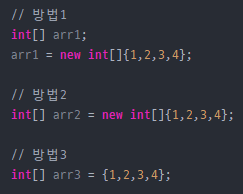 방법1은 선언 이후에 초기화를 다음 라인에서 합니다. 주의할 점은 new int [ ] { 요소 1, 요소 2... }를 반드시 작성해주어야 합니다.