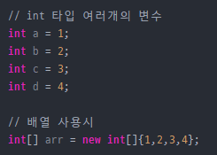 여러 변수들을 라인마다 입력하는 것 보다는 사진처럼 한 줄로 처리하는 게 더 깔끔하고 추후에 관리도 편합니다.