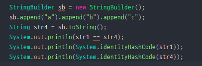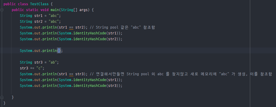 str3는 String을 + 연산을 사용해서 "abc"를 만들었는데도 String pool의 "abc"를 참조하지 않는다.
