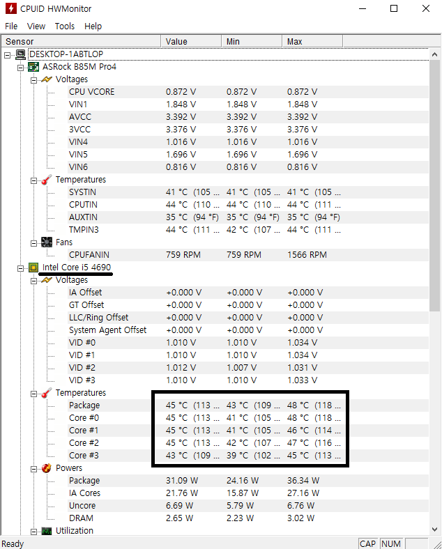 HWMONITOR 프로그램을 이용해서 CPU, 그래픽카드, 보드온도를 체크할 수 있습니다. 검은줄이 CPU가 있는 부분이고 검은 네모박스 안이 CPU온도 입니다 45도로 안정적인 온도입니다.