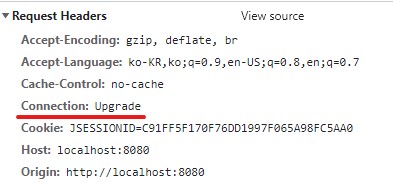 처음 요청시 HTTP Get 으로 Upgrade:web socket 헤더를 추가하여 보냄