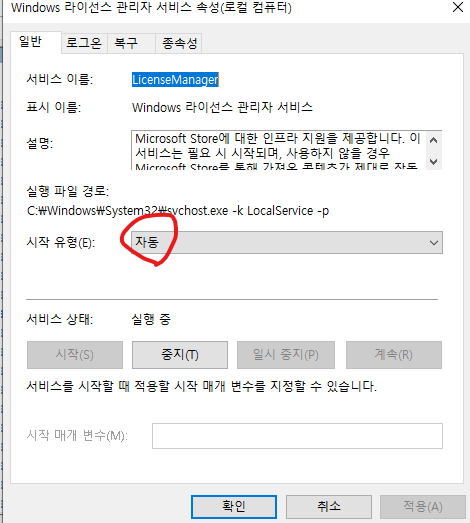 해당 서비스를 더블클릭하고 시작유형을 "자동"으로 수정합니다.