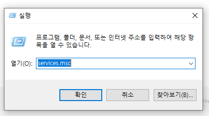 windows + R을 눌러서 services.msc 라고 입력합니다.